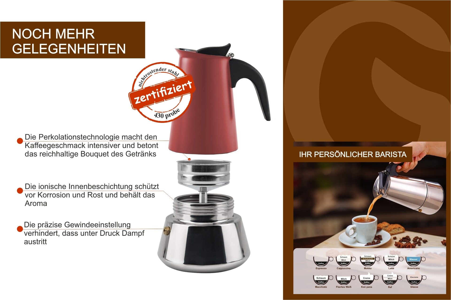 Für alle Herdarten geeignet, auch für Induktion: Elektroherd, Ceranfeld, Gasherd, Induktion, offenes Feuer auf dem Feuer eignen sich für die Kaffeezubereitung in dieser Kaffeemaschine.
